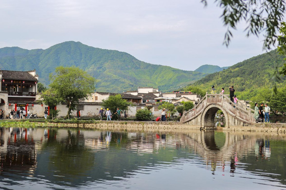 若西递是书,那宏村便是画。6月1日下午,小分队走进了这个画里乡村。黟县宏村依水而建,是古水系牛形村落,巍峨苍翠的雷岗山为牛首,南门的两棵参天古木为牛角,错落有致的居民宅是庞大的牛躯,流经每户门前的明渠便是牛肠,隐匿在青石板下的暗渠为盲肠,月沼为牛胃,各种水系汇聚于村口的南湖(下图),为牛肚。逆水进村、顺水进村是当地水系的一大特色。据史料记载,宏村的水系总设计师是位知书达礼、学富五车、精通于风水建筑的女性——胡重娘。她是黟县名人胡礼朝之女,后嫁为宏村最大家族汪氏一族族长。后人为了纪念这位劳苦功高的先祖,打破了封建时期女人不进宗祠的规矩,破例把她的排位摆进祠堂,供后人感念祭拜。