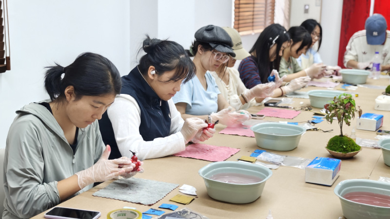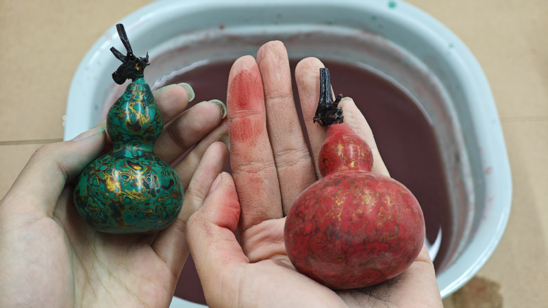 实践环节,每位同学领到一枚已经完成七成工序的半成品葫芦——它已经有了初步的形态和漆底,但还带着些许粗糙。东湖武汉国漆艺术研究中心项老师讲解了打磨的要领,并提醒大家前期要胆大心细,后期要小心翼翼,打磨过程中,有同学用力过猛,磨掉了底漆,露出葫芦原本的颜色;也有同学耐心细致,在沙沙的摩擦声中,让葫芦逐渐变得平整光亮。通过亲手操作,同学们真切体会到了“毫厘之间见功力”的含义。
